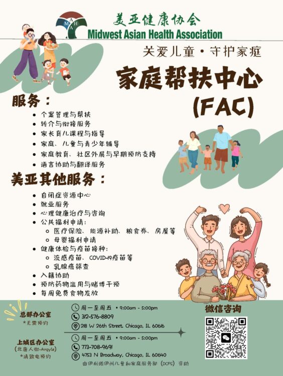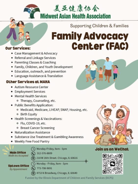 Midwest Asian Health Association’s Family Health Center is the first Asian American Family Advocacy Center in Illinois. The purpose of the program is to promote stable and permanent homes by maintaining, strengthening, and safeguarding the functioning of family and wellbeing of children.